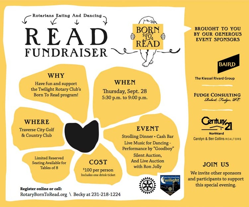 The Rotary Club of Traverse Bay Twilight is hosting a fundraiser on September 28th to benefit Born to Read and you are invited to participate on many levels, including attending, volunteering, and obtaining silent auction baskets. For more information about R.E.A.D. (Rotarians Eating and Dancing), please see the flyer below. If you have any questions about this event or anything else to do with Born to Read, please see the contact information below.